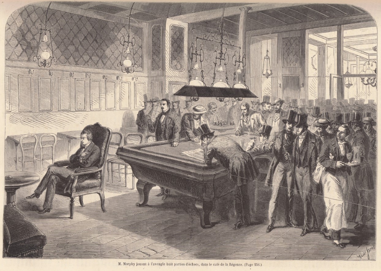 Nachdem das Schachspiel sich im Bürgertum etabliert hatte, trafen sich die Schachfreunde in den Cafés der europäischen Metropolen. Das berühmteste „Schachcafé“ war das Café de la Régence in Paris. Man findet es dort heute noch, in der 167 Rue Saint-Honoré, mitten in der Innenstadt der französischen Metropole. Über das Café ist schon viel geschrieben worden. Berühmte Schachspieler gingen hier im 18. Jahrhundert ein und aus. Es ist die Zeit der Aufklärung und das rationale Schachspiel passte gut in den Zeitgeist. Beim Schach wurde über Gesellschaft und Politik debattiert und im Café de la Régence wurde beim Königsgambit auch die Französische Revolution ausgeheckt. Heute bekommt man hier noch Café, aber Schach spielen ist nicht mehr gern gesehen.