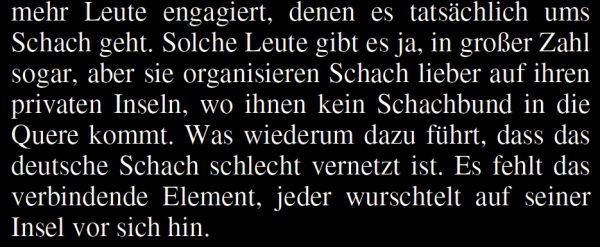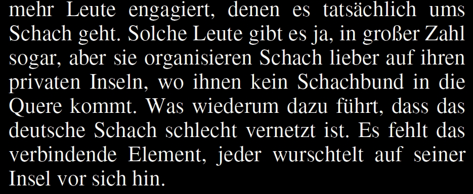 Neulich rief frühmorgens der Präsident eines Schach-Landesverbands am Bodensee an. Am Vortag hatte er in der „Schach“ gelesen, das deutsche Schach sei schlecht vernetzt, die deutschen Schachmacher wurschtelten isoliert auf ihren Inseln vor sich hin. Er wusste nicht recht, ob er sich deswegen grämen soll, und am Ende einer schlaflosen Nacht griff er zum Hörer und fragte: „Bin ich gemeint?“