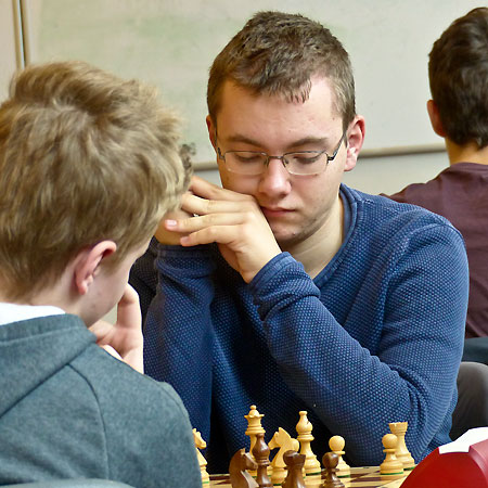 1.Txe5! fxe5 2.Dxf8+ Dxf8 3.Lxh7+ Kxh7 4.Txf8 wenig später erhielt Jonas ein Remisangebot, das er auf mein Geheiß aber ablehnte. Mir war schon beim U25-Open aufgefallen, dass Vincent in der Behandlung von Turmendspielen großen Nachholbedarf hat – ein Mangel, den er offensichtlich noch immer nicht behoben hat. Anstatt mit e5-e4 auf aktives Gegenspiel zu setzen, ließ er den weißen König ungehindert nach e4 laufen und versäumte außerdem, mit g7-g5 die weiße Mehrheit zu blockieren. Jonas rannte mit seinem König bis nach c6, sprengte mit a4-a5! die schwarze Bauernkette und sammelte sämtliche schwarzen Bauern ein, während sein d- und b-Bauer am Leben blieben. Somit stand es nach vier Spielstunden 2:1 für uns, wobei aber klar war, dass an Timos Brett irgendwann noch ein Gegentor fallen würde.
