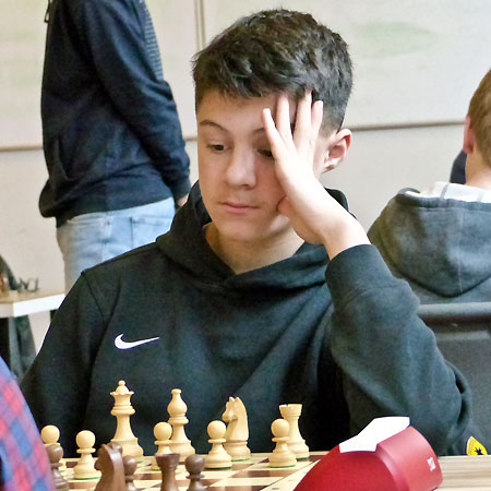 Hier folgte 1.Le7 fxe4 2.Sg5 Lh6 3.Txc5 Dxc5 4.Sxe6 Lxd2 5.Sxc5 exd3 – mit unklarer Stellung. Leider fand Timo in der Folge kein wirksames Rezept gegen den Freibauern auf d6. Er kämpfte zwar unverdrossen im Turmendspiel weiter, aber sein abgeschnittener König ließ nie Zweifel am Ausgang aufkommen. Damit hatten wir unser bestes Brett (gemessen am DWZ-Vergleich) leider ohne Punkt „verbraten“.