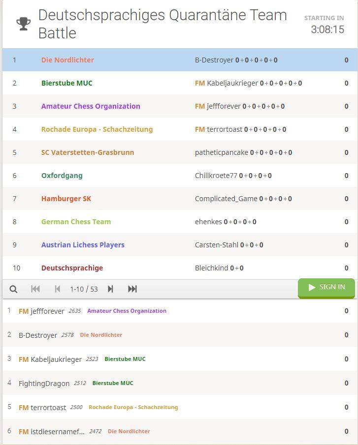 Zehn deutschsprachige Teams werden heute Abend von 20-22h auf Lichess.org gegeneinander antreten. 1 IM sowie 6 FM (insgesamt 43 Spieler-/innen) haben sich für das Turnier bereits angemeldet: