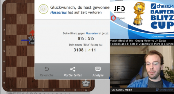 Der polnische Superstar und angehende Top-10-Spieler Jan-Krzysztof Duda wird diese Einschätzung bestätigen. Im Achtelfinale des Banter-Blitz-Cups am Samstag musste er sich eben dieses Georg Meiers erwehren. Und trotz eines nominellen Übergewichts von mehr als 100 Elopunkten unterlag er dem schnellen Deutschen mit 5,5:8,5. Nachdem Donchenko und Blübaum ausgeschieden waren, ist Georg Meier nun der einzig verbliebene Deutsche im Feld.