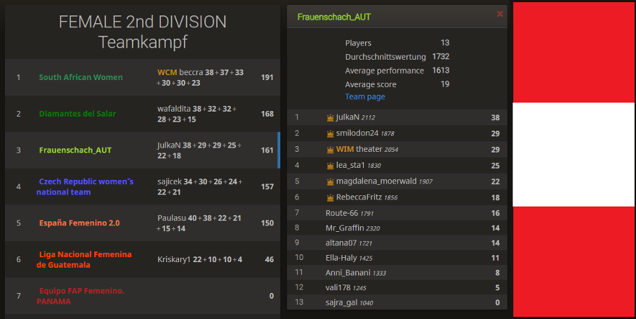 Beim neugeschaffenen Online-Frauenbewerb „Nations Cup“ konnte das österreichische Frauenteam gestern mit 161 Punkten den 3. Platz in der 2. Division erreichen. Knapp hinter Südafrika (191 Punkte) und Bolivien (161 Punkte) reichte das knapp nicht für den Aufstieg in die 1. Division. Die Top-6 eines jeden Teams wurde dabei für die Punktewertung berücksichtigt. Aus österreichischer Sicht bestand diese aus den erfahrenen Blitzerinnen Julia Novkovic mit starken 38 Punkten vor Elisabeth Saler-Grafenberger und Helene Mira mit jeweils 29 Punkten gefolgt von Lea Stadlinger (25 P.), Magdalena Mörwald (22 P.) und Rebecca Fritz mit 18 Punkten. Hervorzuheben ist die Leistung von Julia, die mit dem allgemeinen 3. Platz stets um den Turniersieg mitspielte!