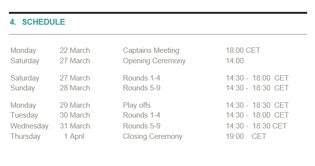Die Finalgruppe (30./31. März) – 10 Teams spielen ein Robin-Round-Turnier mit 9 Runden. Das 10. Team wird von ECU, dem Sieger des European Women’s Online Chess Club Cup- Cercle d’Echecs de Monte-Carlo eingeladen.