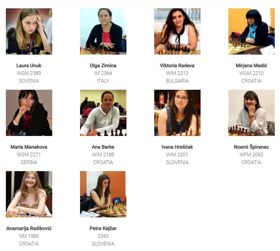 Radeva angeführt, und die Slowene Ivana Hrešćak ist eine sensationelle Gewinnerin der 19. Blume des Mittelmeers. Daher wird ihre erfolgreiche Leistung bei diesem Turnier erwartet auch. Als Mitglied des Organisationsclubs ist die internationale Ana Berke eine zweifache hochrangige Staatsmeisterin, die Bände über ihre Stärke spricht, und die Slowene Petra Kejžar kann mit ihrem ernsthaften Ansatz und ihrer Erfahrung viele verärgern. Fide-Meister Noemi Špiranec hat bereits genug Erfahrung, aber auch das Wissen, um eine wichtige Rolle im Turnier zu spielen, und ein Mitglied unserer Club-Juniorin Anamarija Radiković, obwohl mit wenig Erfahrung in der Teilnahme an solchen Turnieren, hat bereits eine Silbermedaille beim Senior Staatsmeisterschaft. erfolgreich. Sicherlich wird dieses Turnier eine weitere großartige Gelegenheit für sie sein, sich weiterzuentwickeln, denn es fehlt ihr sicherlich nicht an Liebe zu Schach und Talent.