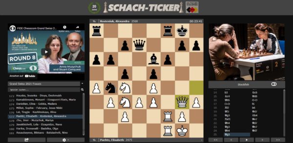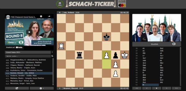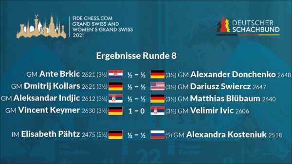Im Women’s Grand Swiss bleibt Elisabeth Pähtz nach ihrem Remis auf dem alleinigen zweiten Platz. Im offenen Turnier knetet sich Vincent Keymer erfolgreich zum Endspielsieg und meldet sich nach der gestrigen Niederlage stark zurück! Partien Partien Turnierseite Resultate Continue Reading Previous FIDE Chess.com Grand Swiss: Zusammenfassung der 7. RundeNext FIDE Chess.com Grand Swiss: Zusammenfassung der 8. Runde More Stories DSB Grand Swiss FIDE Grand Swiss: Vincent Keymer wird Fünfter und stößt in die Top-20 vor November 6, 2023 Deutscher Schachbund Grand Swiss Quelle: Fide FIDE Grand Swiss und WGS bieten Preisgelder in Rekordhöhe März 21, 2023 Franz Jittenmeier Grand Swiss Quelle: Fide Dana Reizniece-Ozola begrüßt die Schachköniginnen in München Februar 2, 2023 Franz Jittenmeier Grand Swiss Quelle: Fide Wesley So gewinnt FIDE Grand Prix Berlin April 5, 2022 Franz Jittenmeier Grand Swiss Quelle: Fide Isle of Man richtet FIDE Grand Swiss und Women’s Grand Swiss 2023 aus März 19, 2022 Franz Jittenmeier Grand Swiss Interview Rückblick Oparin über Oparin beim Grand Swiss November 15, 2021 Thomas Richter