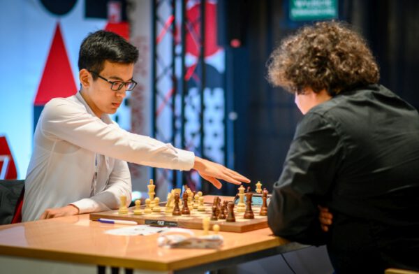 Ihnen folgen neun Spieler mit 6,5 Punkten, darunter die Schwergewichte Hikaru Nakamura und Fabiano Caruana . Letzterer (der am ersten Tag eine verheerende Niederlage gegen Abdusattorov hinnehmen musste ) hat das Glück, in dieser Gruppe zu sein, da er dank eines Versehens seines Gegners eine verlorene Partie in Runde sieben gegen Andrei Volokitin retten konnte .