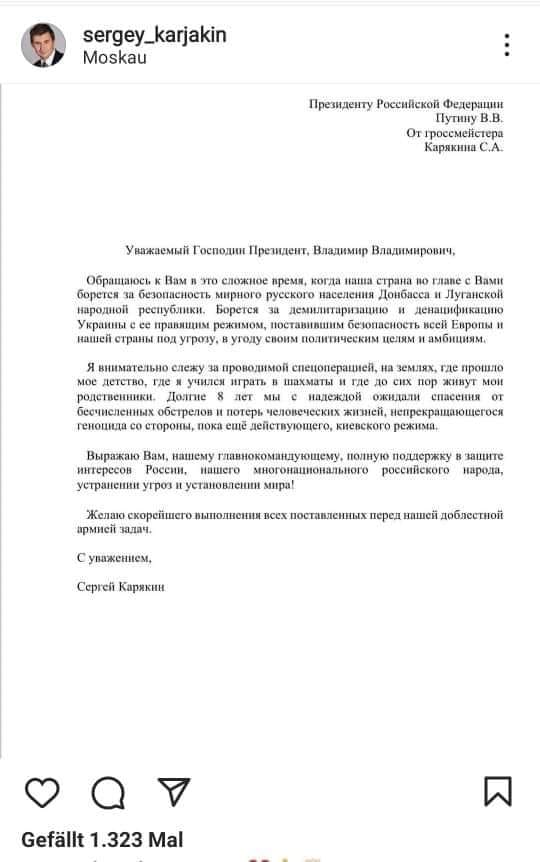 Nachfolgend der Brief als Kopie, den Karjakin auf Twitter veröffentlicht hat. Die Übersetzung ist von GM Michael Prusikin, der in der Ukraine geboren ist .