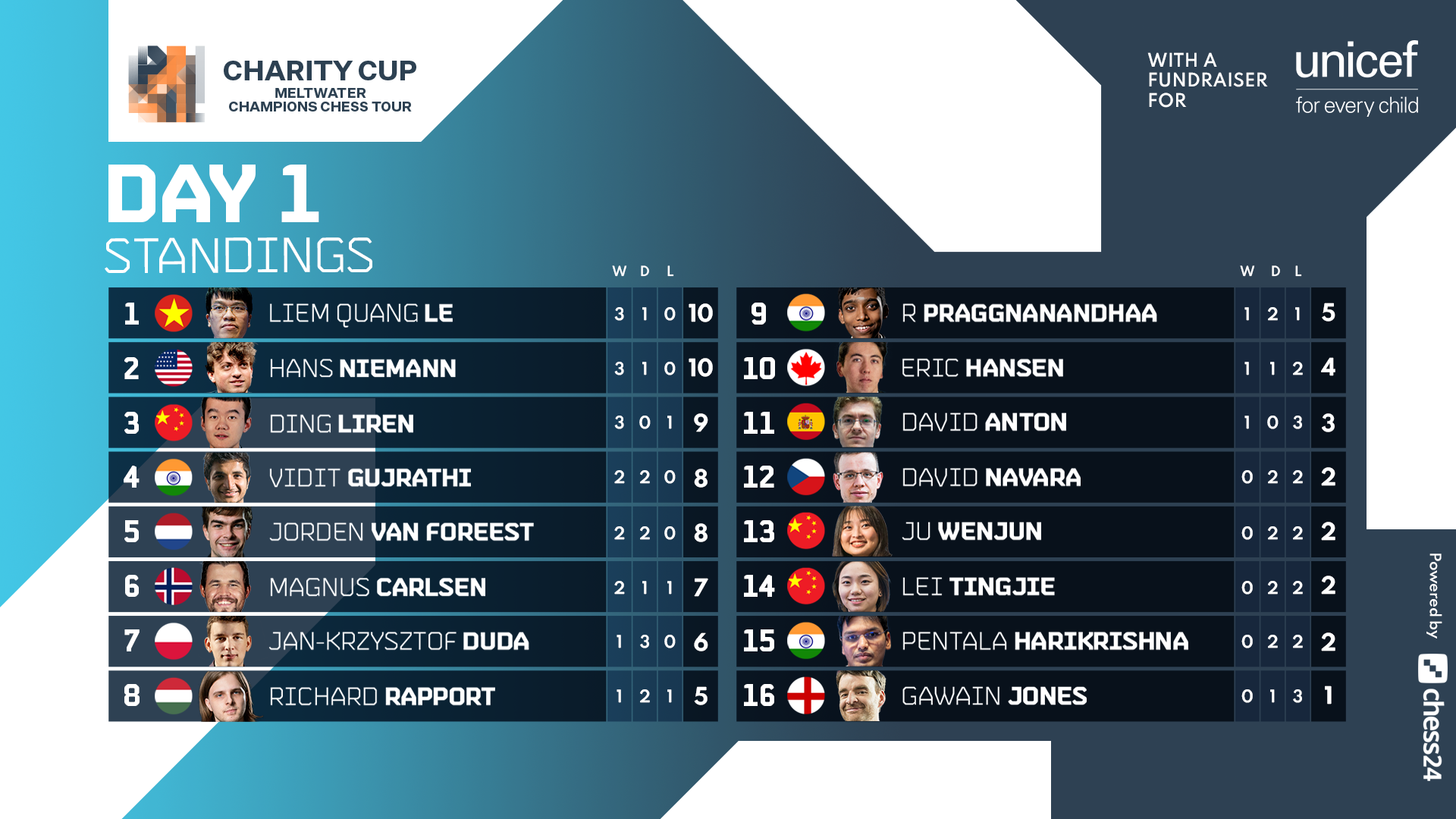 Der vietnamesische Star Liem Quang Le und der jugendliche Amerikaner Hans Niemann gaben am ersten Tag des Charity Cups das Tempo vor, als mehr als 17.000 Dollar an UNICEF gespendet wurden.