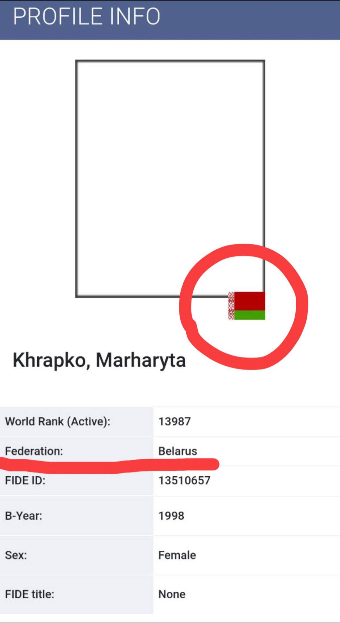 Heute vor der ersten Runde überprüfte Evgeniya die Spieler an den ersten Brettern – ihre potenziellen Gegner an Brett 1 – und fand eine Person, deren Föderation mit „FID“ (=FIDE) angegeben war. Aber interessanterweise, als sie auf die FIDE-ID klickte, war dort ganz klar die Flagge von Weiß zu sehen.