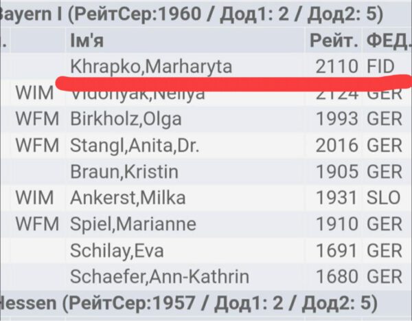 Kehren wir nun zum Turnier zurück. Am ersten Brett meiner württembergischen Mannschaft steht WGM Evgeniya Doluhanova, die aus Charkiw kommt, einer der Städte, die am meisten unter der unprovozierten russischen Aggression gelitten haben. Übrigens, in unserer Mannschaft sind 4 Ukrainerinnen: Evgeniya (Brett 1), WFM Tatyana Kostak (Brett 3), WIM Halyna Timofeeva (Brett 6) und ich (Brett 4).
