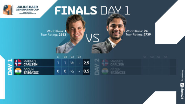 Magnus Carlsen steht kurz davor, als erster Spieler die historische Marke von 2900 Tour-Ratings zu erreichen, nachdem er den „Iceman“ Arjun Erigaisi am ersten Tag des Finales des Julius Baer Generation Cups besiegt hat.