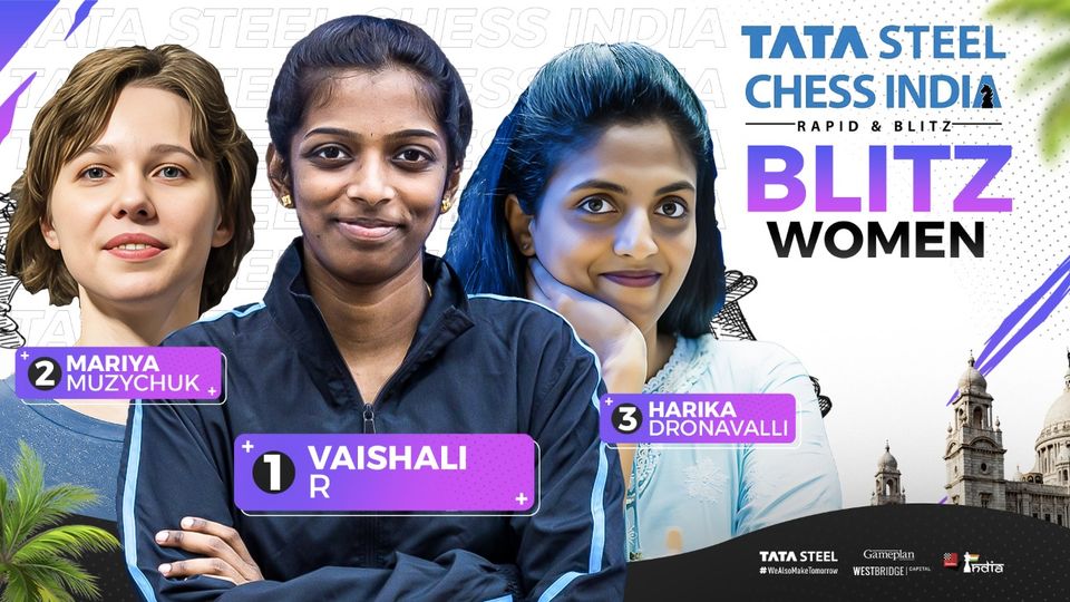 Vaishali R wird die allererste Tata Steel Chess India Blitzmeisterin der Frauen, mit einem gewaltigen Vorsprung von 1,5 Punkten vor dem Rest des Feldes. Vaishali begann den Tag mit einem vollen Punkt Rückstand auf die Führende, aber am Ende der neun Runden erzielte sie 6,5 von 9 Punkten – sie gewann fünf Partien, gab drei Remis und verlor nur eine gegen Anna Muzychuk.