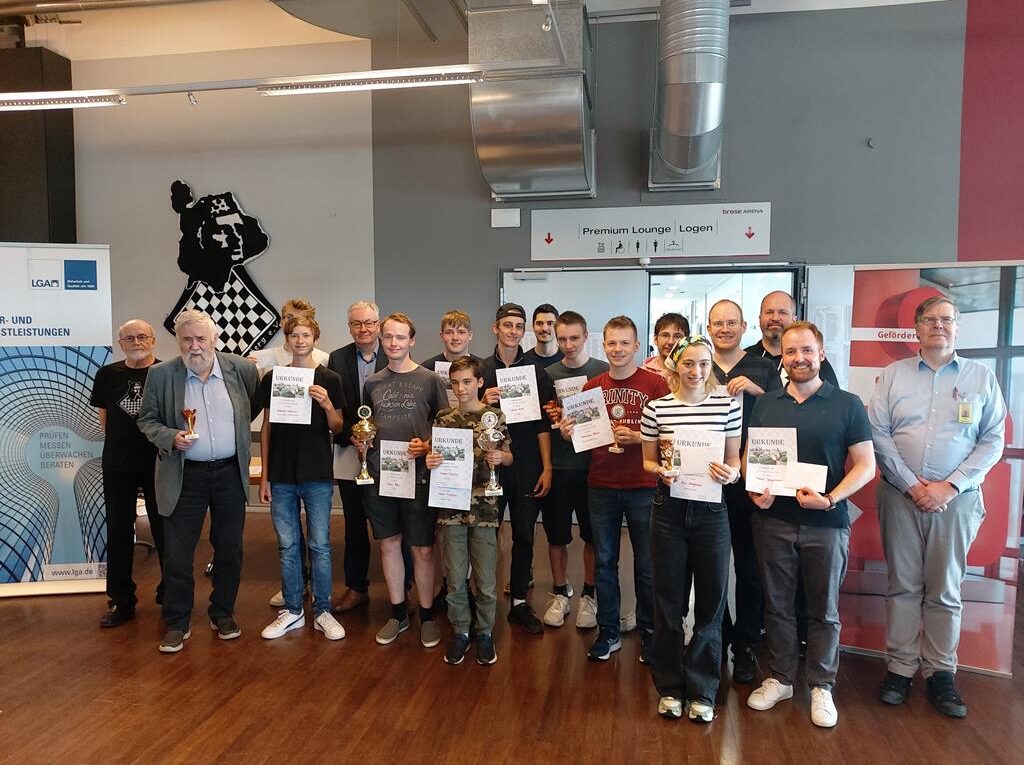 Bildunterschrift: Sieger des A-Opens: In der Mitte mit goldenem Pokal Gesamtsieger FM Hans Möhn, Dresden, mit silbernem Pokal 4. und bester Franke der 12-jährige Stepan Mohylnyi aus Nürnberg.