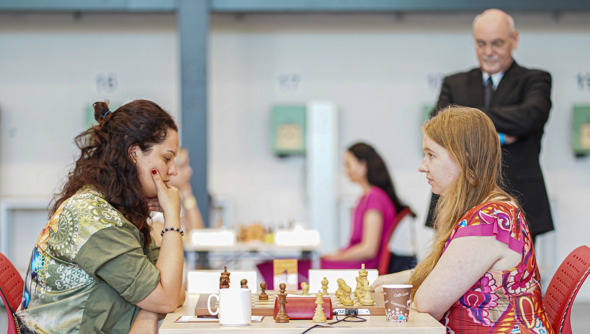 In der ersten Runde des Tages hat sich im Frauenturnier an der Spitze nichts verändert. Es wurde zwar gekämpft, aber alle drei Spitzenduelle endeten Remis. Rebecca Doll, im ersten Bild rechts, bleibt die bisherige Überraschung des Turniers. Mit 1799 Elo ist sie bisher ungeschlagen, liegt einen halben Punkt hinter der Spitze und hat bereits ein Eloplus von 84 Punkten angesammelt.
