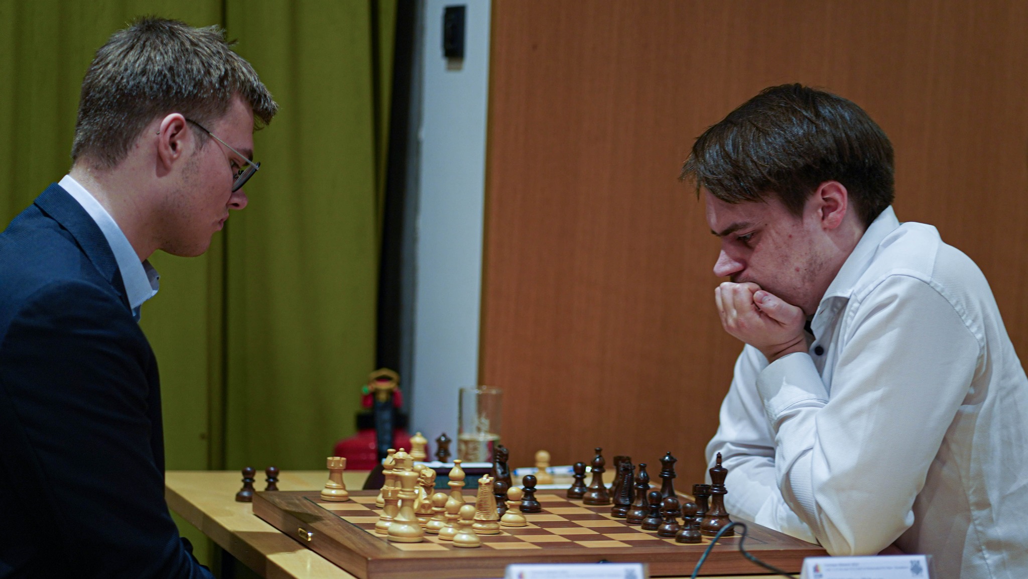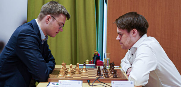 Für das einzige Remis des Tages sorgten Frederik Svane und Matthias Blübaum. Eine ruhige Partie in der Nimzoindischen Verteidigung mündete schnell in ein abgelehntes Damengambit, in dem Matthias mit hängenden Bauern spielte. Zwar gelang es Frederik, das dynamische Bauernduo zu sprengen und in Bewegung zu zwingen, doch eine Ungenauigkeit ließ seinen Vorteil verpuffen. Dem Generalabtausch ins Schwerfigurenendspiel folgte die schnelle Punkteteilung.