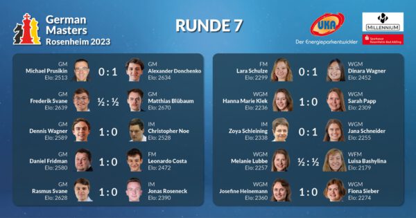 Damit führen nach sieben Runden Dennis Wagner und Alexander Donchenko (je 5/7) das Turnier an. Beide haben es in den letzten beiden Runden mit Spielern aus der hinteren Tabellenhälfte zu tun, sodass es möglicherweise zu einem Fernduell kommen könnte. In Lauerstellung liegen Daniel Fridman und Rasmus Svane (je 4,5).