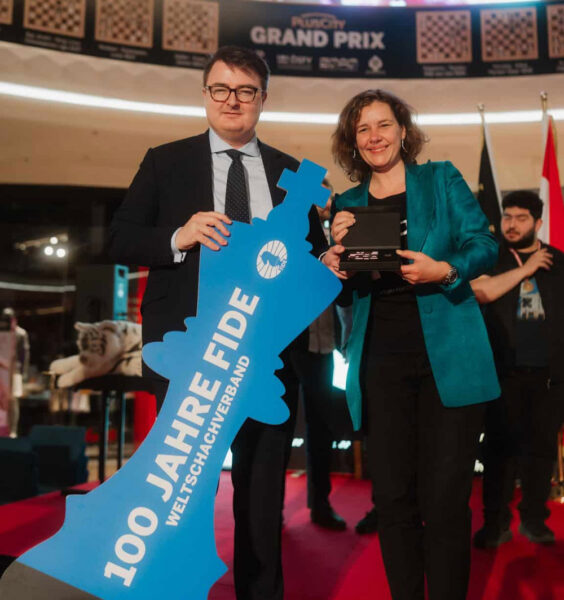 Im Umfeld des Grand Prix hat die FIDE in Linz eine Sitzung ihres „Management Boards“ abgehalten. Die stellvertretende Vorsitzende Dana Reizniece-Ozala, ehemals Finanzministerin in Lettland, bedankte sich bei Michael Stöttinger für die Organisation des Grand Prix und überreichte ihm als Anerkennung die 100 Jahre Jubiläums-Medaille der FIDE. Der Grand Prix in Pasching dauert noch bis morgen Sonntag. Heute steht der Einzelbewerb im Blitzschach am Programm, morgen der Team-Bewerb im Schnellschach. (wk, Fotos: Fotomeisterei.at/ Laura Gelbmann)