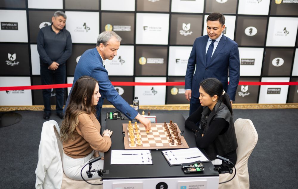 As the clock neared 15:00, players entered the elegant hall on the 11th floor of the Rixos Khadisha Hotel, with its chandeliered grandeur and golden accents that perfectly captured the prestige of the occasion. Tension filled the air as players settled into their seats, ready for the battles ahead. The ceremonial first move was made by Gabit Abdimazhitovich Syzdykbekov, Mayor of Shymkent, on board one between Nurgyul Salimova and Bibisara Assaubayeva—marking the board where the first victory of the day would later unfold.