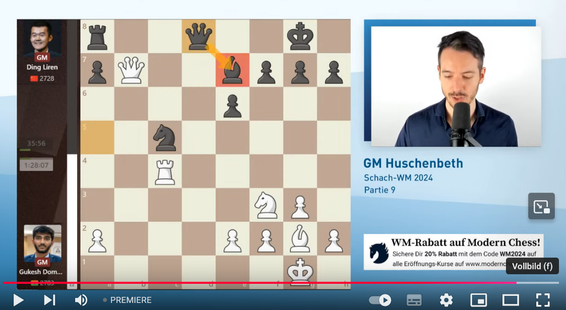https://youtu.be/Lq3JwmGWEoUHey Leute, auch die 9. Partie der Schach-WM ist Geschichte! Kann einer der beiden Kontrahenten die Führung übernehmen? Ihr findet es hier in meiner Video-Analyse heraus: https://youtu.be/Lq3JwmGWEoU